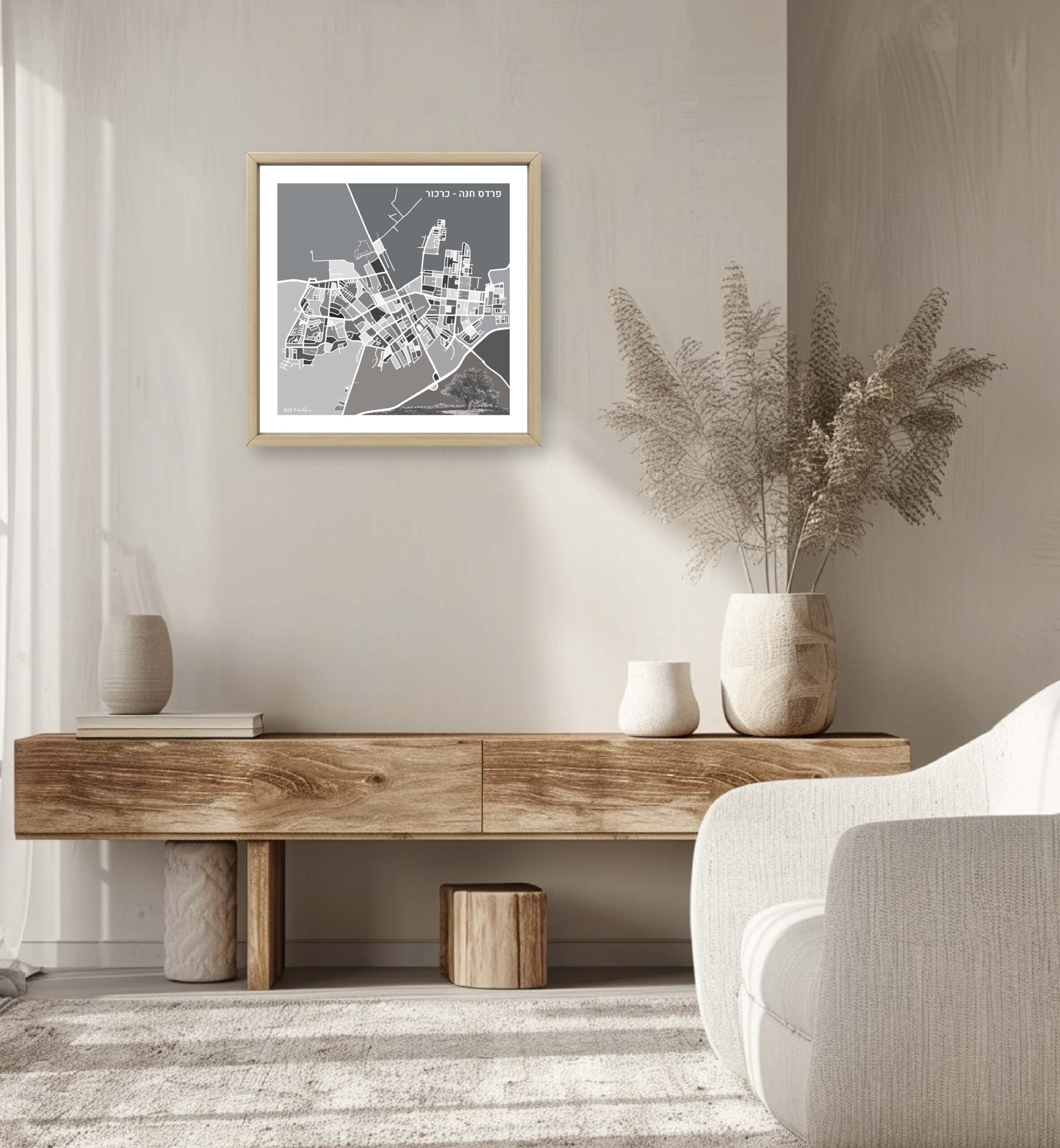המפה מודפסת על נייר פוטו עבה ואיכותי, וממוסגרת עם מסגרת עץ איכותי בצבע שחור לבן ועץ אלון טבעי.